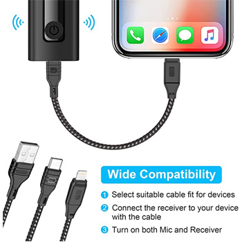 Upgraded external wireless lav mic comes with a 3.5mm TRS receiver, a type-c to IOS cable, a type-c to Android cable, a type-c to USB cable.