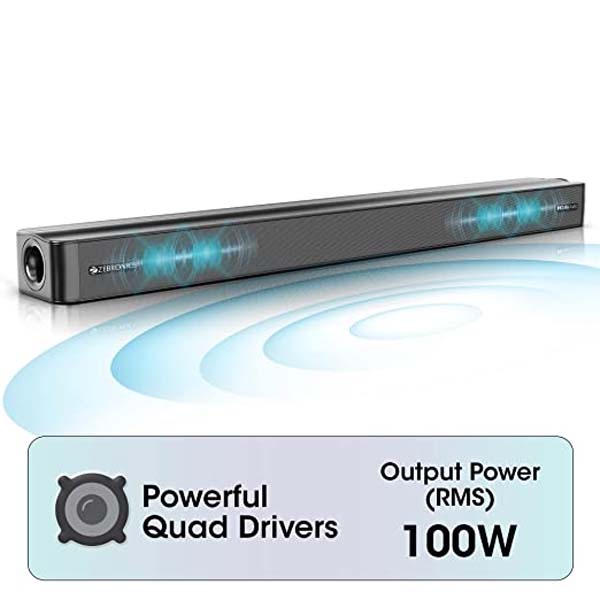 Experience Dolby Audio decoding, with immersive sound stage, clear audio and extreme detailing while connected to Smart TVs (with Dolby Audio) and other suitable devices. With 100 Watts RMS output power, the soundbar's Quad drive configuration provides the best balance of clear dialogues, room filling virtual surround audio and a pleasant yet powerful output.