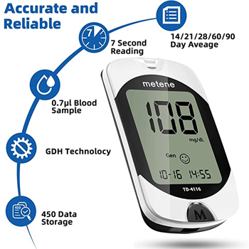 This blood glucose meter kit just need 0.7 microliter blood sample and 7 seconds to get you blood glucose value; Fast, minimize wound and less painful.