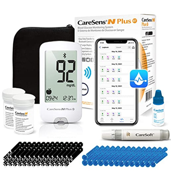CareSens N Plus Bluetooth Diabetes Testing Kit includes 1 blood glucose meter, 100 blood sugar test trips, 1 lancing device.
