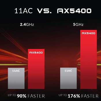 Next-Gen Speed and Range: Combined speeds up to 5.4 Gbps. Get 5GHz band speeds up to 90% faster than the equivalent 2.4 GHz 11 each and up to 176% faster than the equivalent 5 GHz 11 Ac, for better 4K streaming, gaming and downloading. Exceptional Capacity: Connect more devices at faster speeds. Up to 4x greater capacity than 11 Ac, so more devices can connect at once.